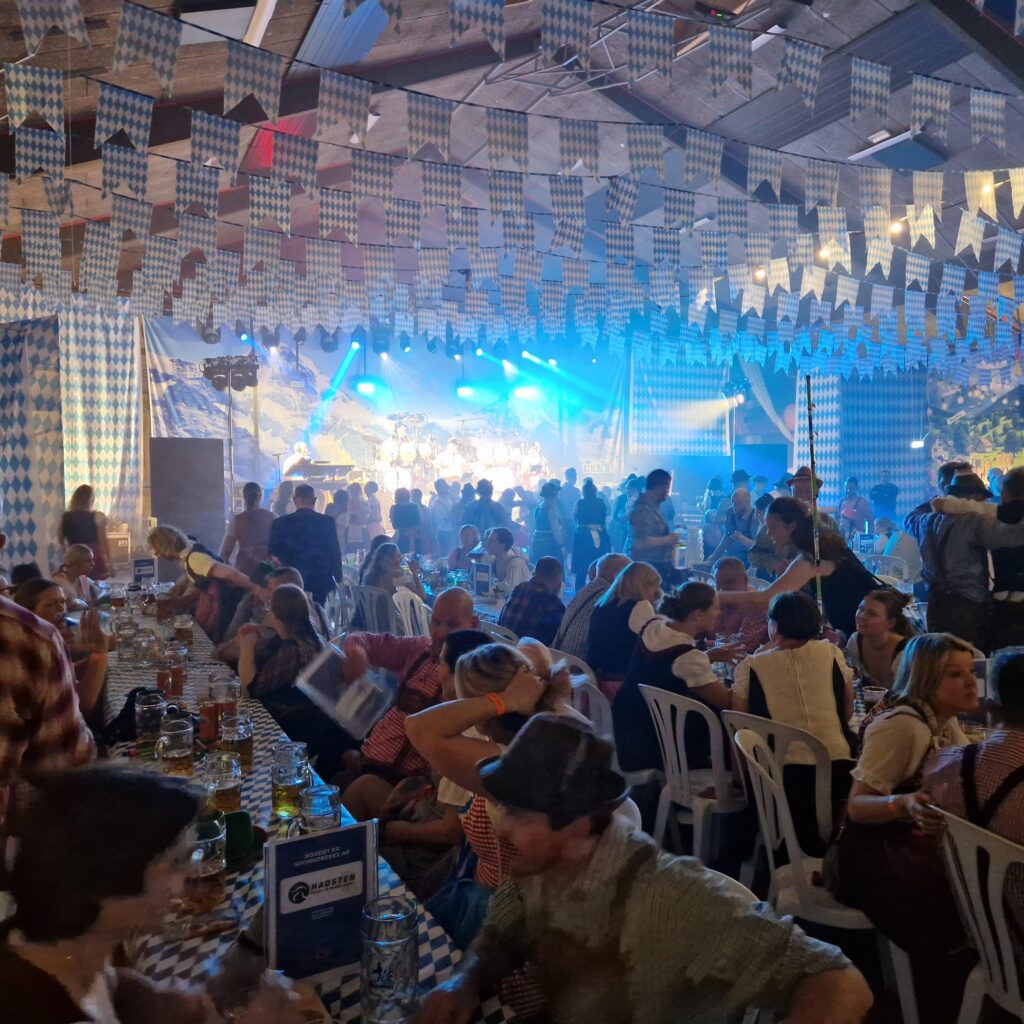 Hadsten Hallen, der atter blev en gang transformeret, så den til forveksling lignede en gigantisk tyrolerstue, de gode wienerschnitzler med brasede kartofler, sovs og gemüse fra MadXpressen, orkestret Top7, masser af fadøl i hanerne, jägerbombs og humørfyldte unge fra håndboldklubben i baren er nogle af grundstenene til den succesfyldte bierfest.