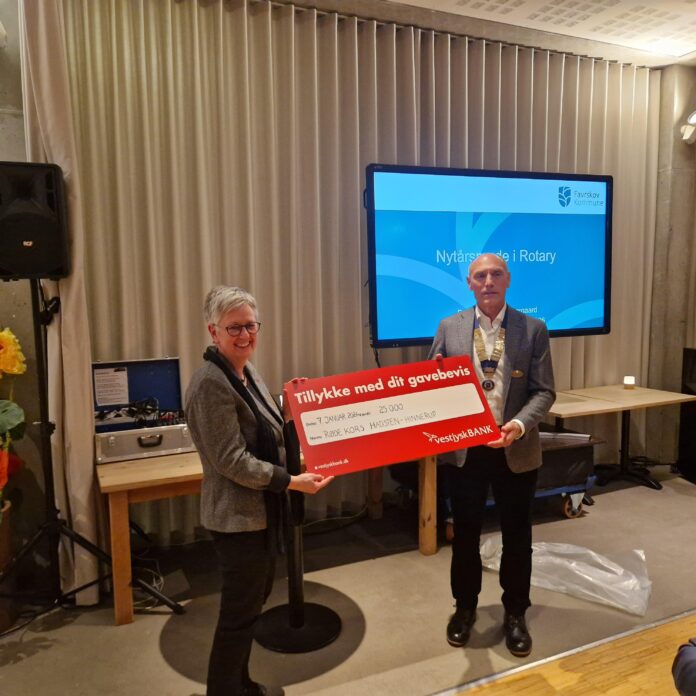 Beløbet blev overrakt på en check til formand for Hadsten-Hinnerup Røde Kors Margit Larsen til Rotarys årlige nytårsmøde i Sløjfen i Hadsten, hvor de tre klubber var samlet for at høre borgmesterens nytårstale.