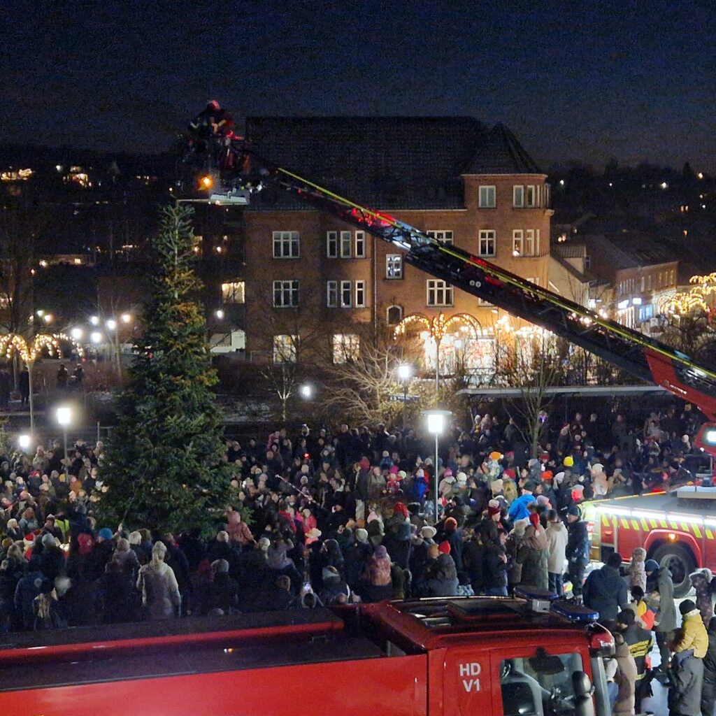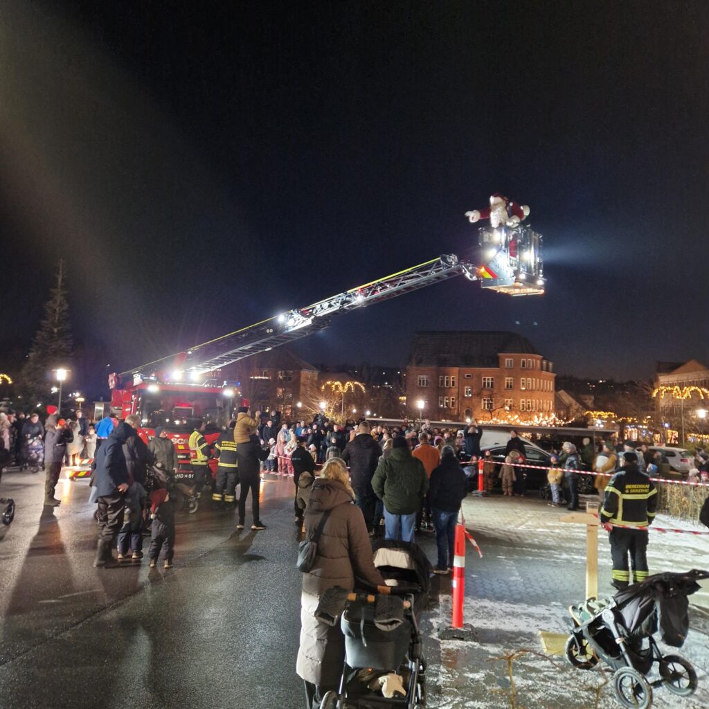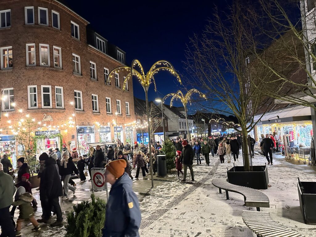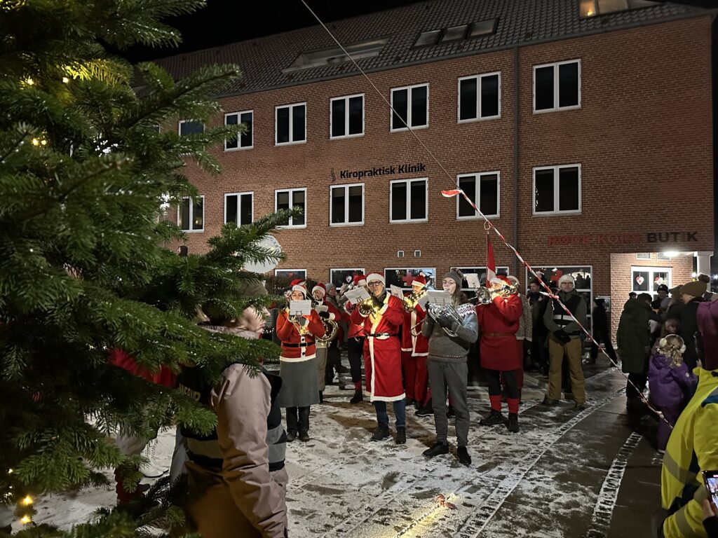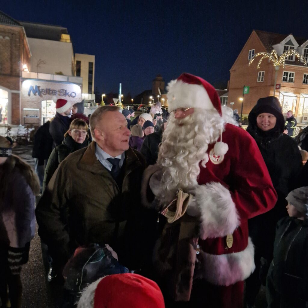 Oppe ved juletræet bød borgmester Lars Storgaard velkommen og holdt en munter og tilpas kort juletale, inden han, sammen med alle børnene og voksne, talte ned fra ti. Julemanden var imellemtiden blevet hejst op i den store lift på en brandbil, og kunne herfra, oppe i toppen af juletræet, tænde de mange lys til stor begejstring. Det var et lille magisk øjeblik, og man fornemmede i den grad begejstringen på hele pladsen.