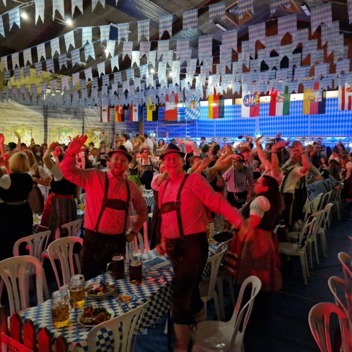 Når godt 720 feststemte gæster, mange af dem iført tyrolertøj, indfinder sig i Vestjysk Bank Arena ved middagstid i morgen lørdag, så står den på Wienerschnitzel og klassisk tilbehør og naturligvis masser af skummende fadøl.