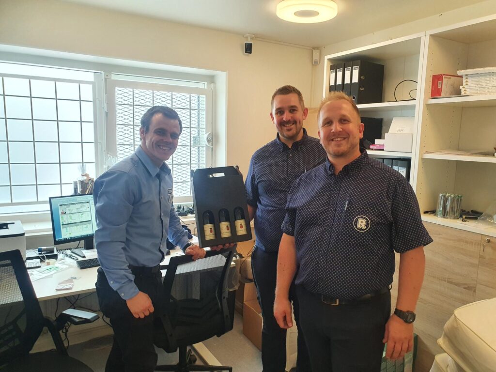 Butikken var da også godt fyldt og køen ved disken var lang og vi gik derfor lige ind på kontoret til en kort snak inden Svenne skulle ud til kunderne igen. Mens vi sad der kom naboen (Rema 1000) forbi med en velkomsthilsen.