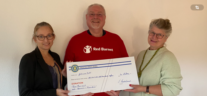 Michael Hejlskov Jacobsen, som er forperson for Red Barnet Farvskov, har modtaget en check på 8800 kr. fra InnerWheel Hadsten.
