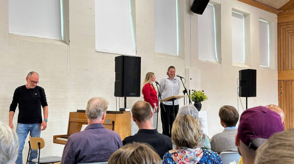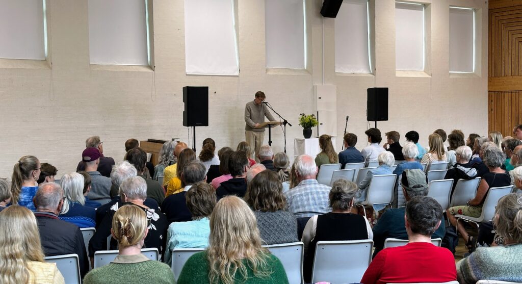 På højskolen var hovedtaler, sognepræst Peter Ulvsgaard netop begyndt, da ByensNyt nåede frem. Også her havde man valgt at holde arrangementet indendørs til en start, og der var godt fyldt op i skolens gymnastiksal. Peter Ulvsgaard er tidligere sognepræst i Hadsten, men er nu præst i blandt andet Spentrup sogn ved Randers. Han holdt en tale omkring den tid vi lever i nu, med tråde tilbage til både 2. verdenskrig, frihedskæmperne fra Hvidsten-gruppen og Steen Steensen Blicher og hans kone Ernestine, med hvem han fik 11! børn. Han talte også om at vi ikke må miste troen og håbet, selv i en tid, hvor det nogen gange kan være svært med tanke på krige, klimaforandringer og Trump.