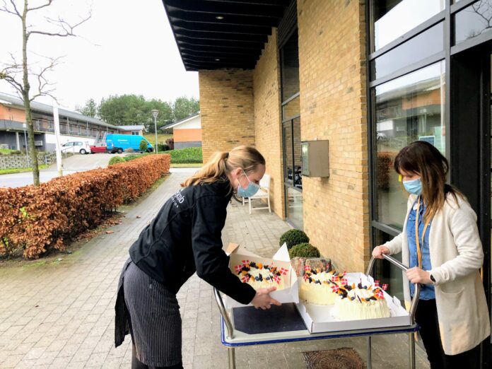 I søndags blev alle beboere på Møllegården vaccineret første gang mod Covid-19, og det syntes man hos byens bager, Mester Jacob, skulle markeres, og derfor stod den i dag på lagkage til Møllegården.