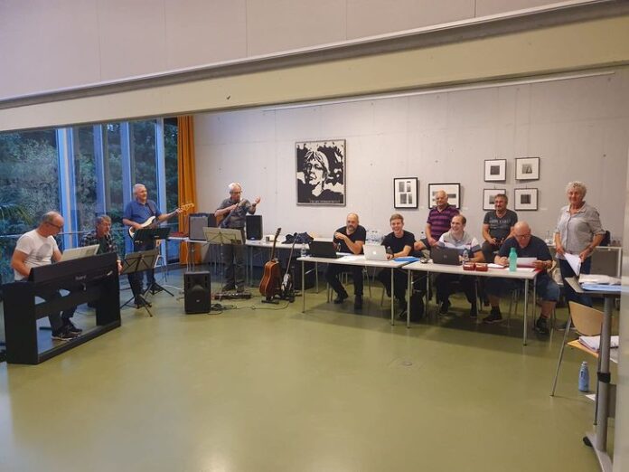 På billedet ovenfor er det dog for en gangs skyld revyens musikere, teknikere og back stage folk, der er i fokus. Fra venstre revyorkestret; på tangenter kapelmester Lars E. Christiansen, trommer Svend Erik Funder, bas Lars Johansen og guitarer og banjo Jens Jacobsen.