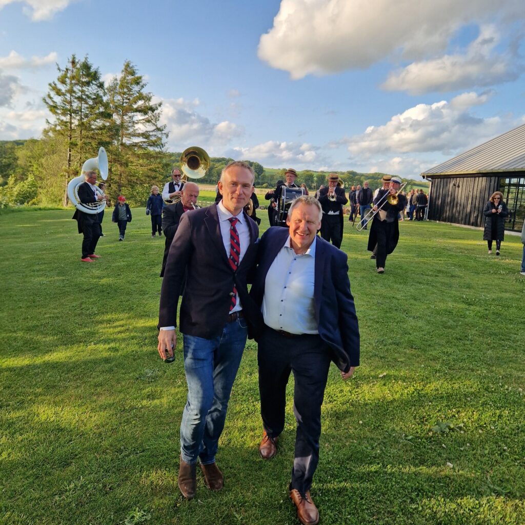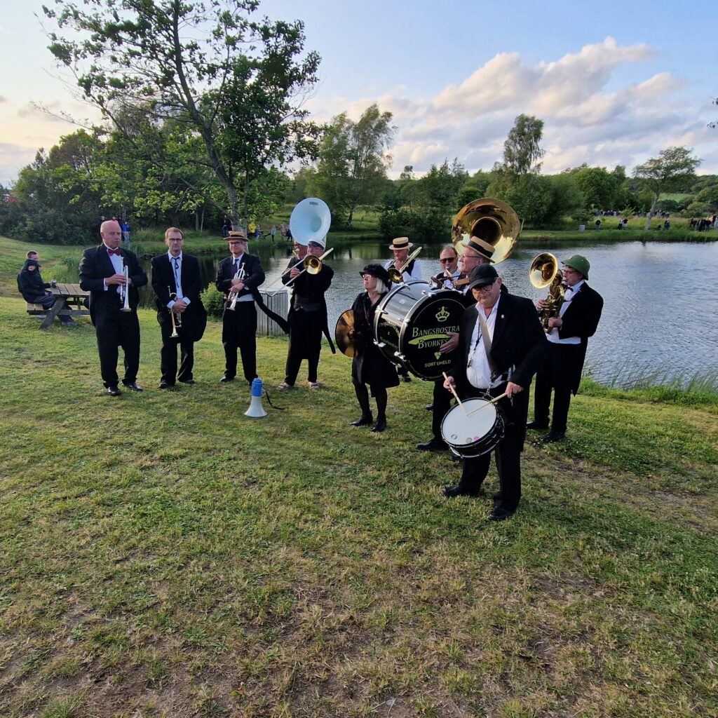 I spidsen for Bangsbostrand Byorkester kom Flemming Viktor Andersen og Borgmester Lars Storgaard marcherende til bålpladsen, hvor de mange gæster hyggede sig i aftensolen og nød omgivelserne ved søerne med et glas øl i hånden.