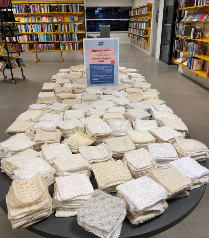 Opgaven gik ud på at strikke/hækle en eller flere firkanter på 12 x 12 cm. af hvidt restegarn og aflevere dem på biblioteket senest 1. december. I løbet af november måned er der blevet afleveret ikke mindre end 1350 hvide firkanter!
