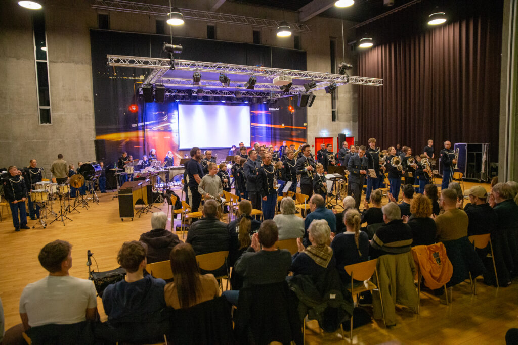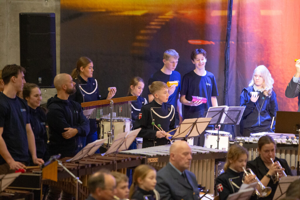 Normalt, når der er koncert i Lilleåsalen i Sløjfen, så er musikerne oppe på en scene, mens publikum sidder i salen. Tirsdag aften fyldte musikerne næsten hele Lilleåsalen, så man havde skubbet væggen til side, og så sad langt det meste af publikum på den store trappe op til biblioteket. Så det var på alle måder en helt særlig koncert, hvor Prinsens Musikkorps, Hinnerup Garden og elever fra Favrskov Musikskole gav prøver på deres kunnen.