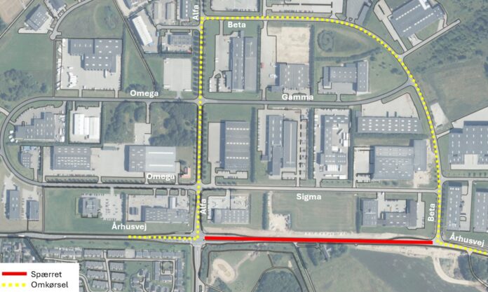 Her vil dele af Århusvej nemlig være spærret mellem klokken 9-14 fra mandag til onsdag (30. marts-1. april). Spærringen medfører at der i perioden vil være omkørsel via Alfa og Beta i Søften Erhverv.