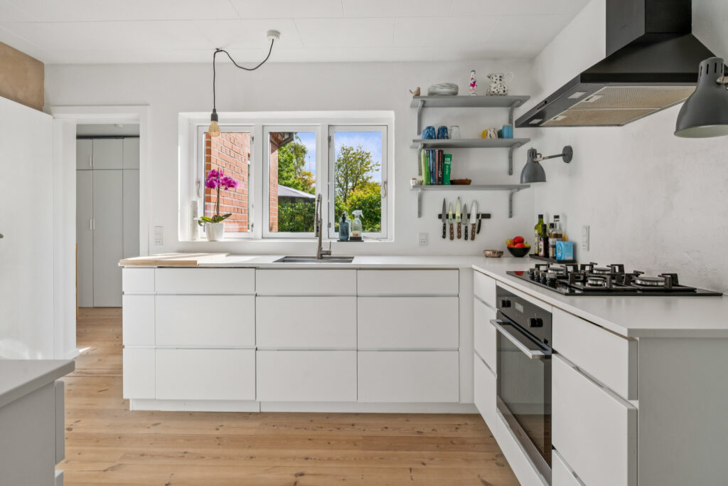Orangeriet er prikken over i’et, for den forlænger udesæsonen betragteligt i begge ender, og den skaber ligeledes mulighed for at gå tørskoet ned i kælderen. Og hvis vi starter her, får I en anvendelig etage med flere disponible rum, som egner sig ideelt til opbevaring, vaskerum og deslige. Oppe i stueplan starter den rigtige boligoplevelse, og her breder flotte plankegulve sig mellem et åbent køkken samt opholds- og spisestue i forbindelse.