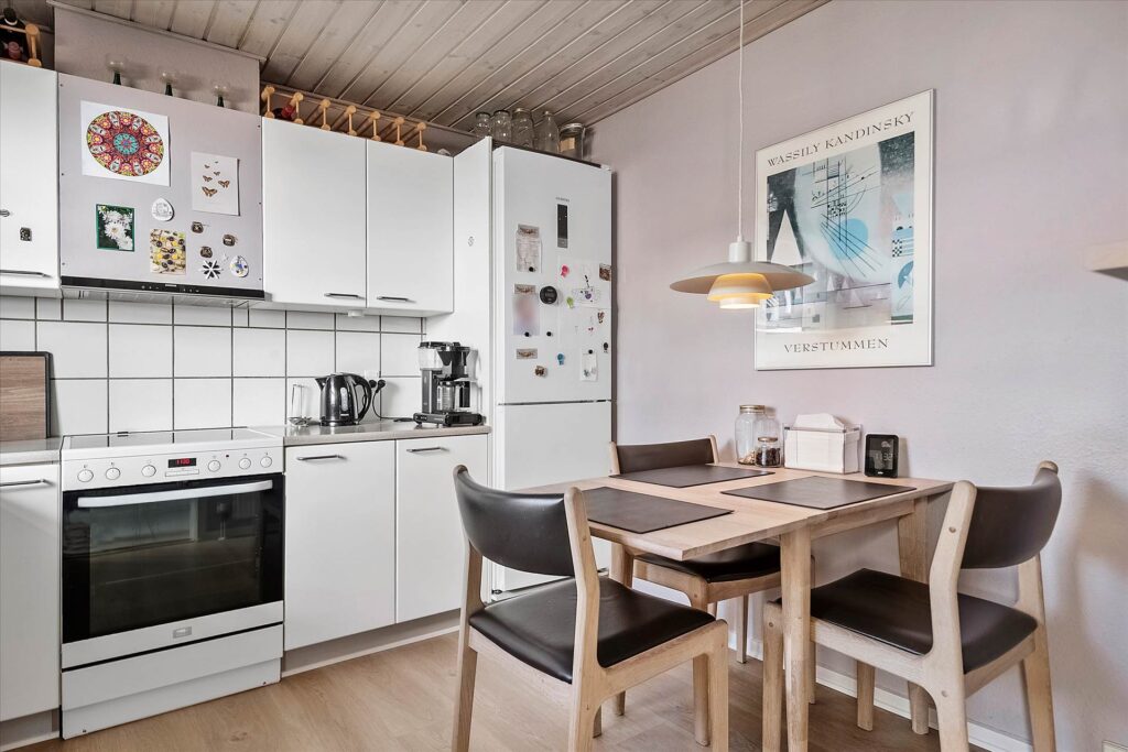Derudover gør det store vinduesparti i stuen at lyset strømmer ind i hjemmets hjerte, og sikrer at boligen opleves lys og indbydende. Rækkehuset er perfekt til par, enlige eller den lille familie. Fra stuen er der direkte udgang til en sydvendt terrasse, hvor solen er til stede fra morgen til aften. Terrassen er et oplagt sted at tilbringe store dele af både foråret og sommeren.