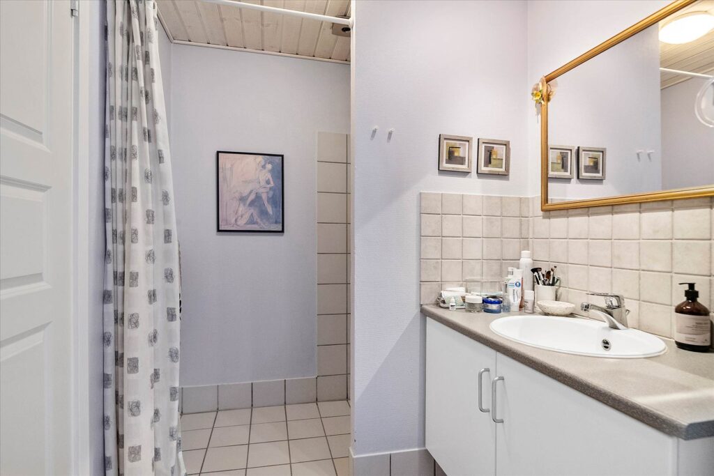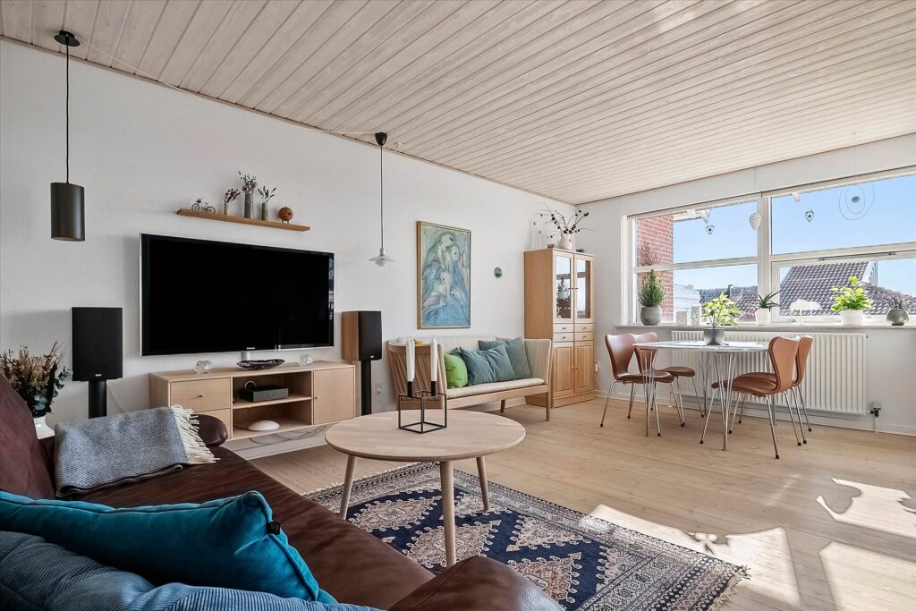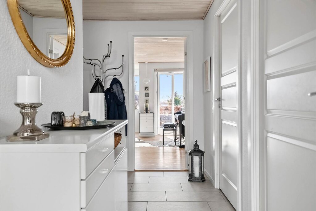 For enden af gangen er den lyse og åbne stue, med fantastisk lysindfald fra de store vinduespartier, samt endnu et værelse med let adgang til husets badeværelse. I badeværelset er det indlagt gulvvarme hvilket giver ekstra komfort i de kolde tider.