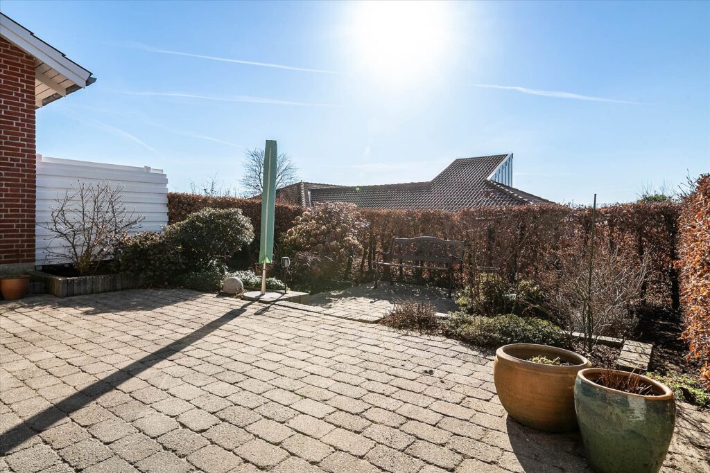 Derudover så er terrassen flisebelagt, og dertil et mindre stykke med grøn beplantning, hvilket minimerer vedligehold og sikrer maksimal bekvemmelighed. Derudover er der en dejlig carport med plads til bilen, samt et lille skur med plads til cyklen eller anden opbevaring.