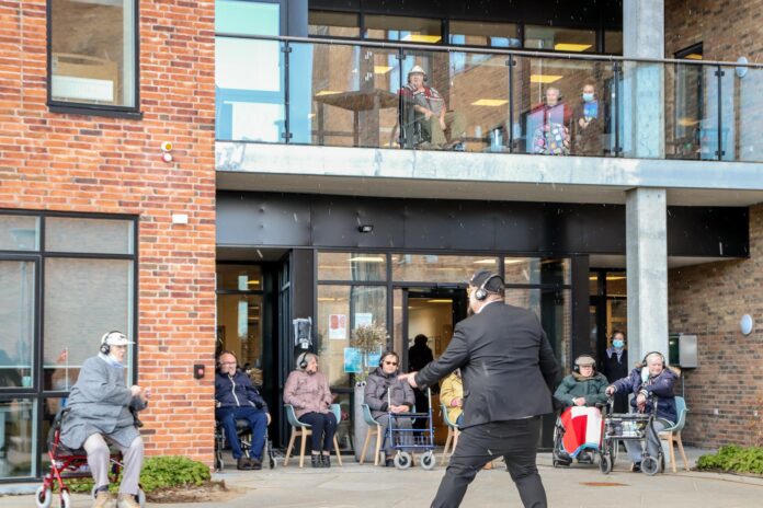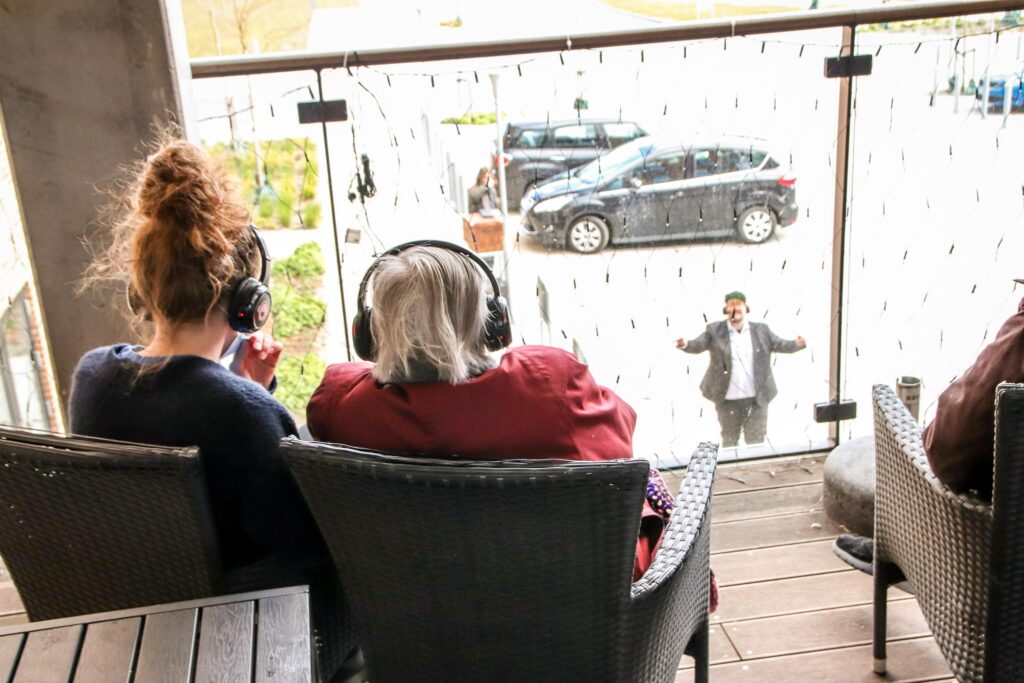 I går var der teaterforestilling på plejecenter Solhøj i Hammel, hvor beboerne blev udstyret med høretelefoner, så de kunne være tilskuere til forestillingen, der foregik i det fri.