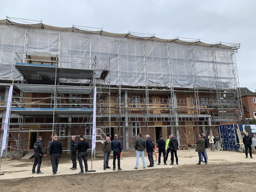 De obligatoriske kranse og flag var naturligvis blevet placeret i toppen af den nybyggede del af byggeriet, der snart bliver til 47 familiers nye hjem. Det forventes at byggeriet, der også omfatter den tidligere skole, står klar i starten af 2026.