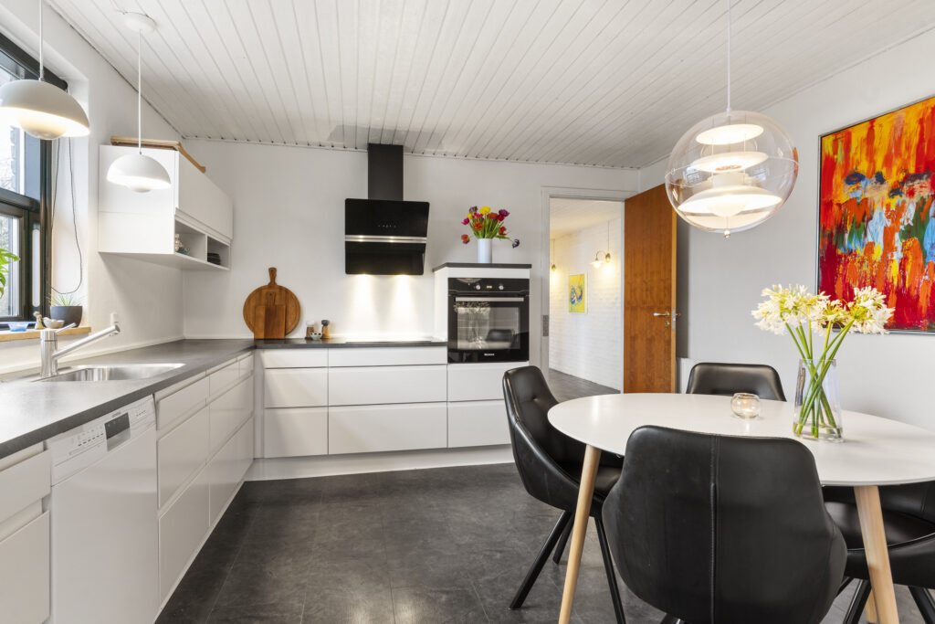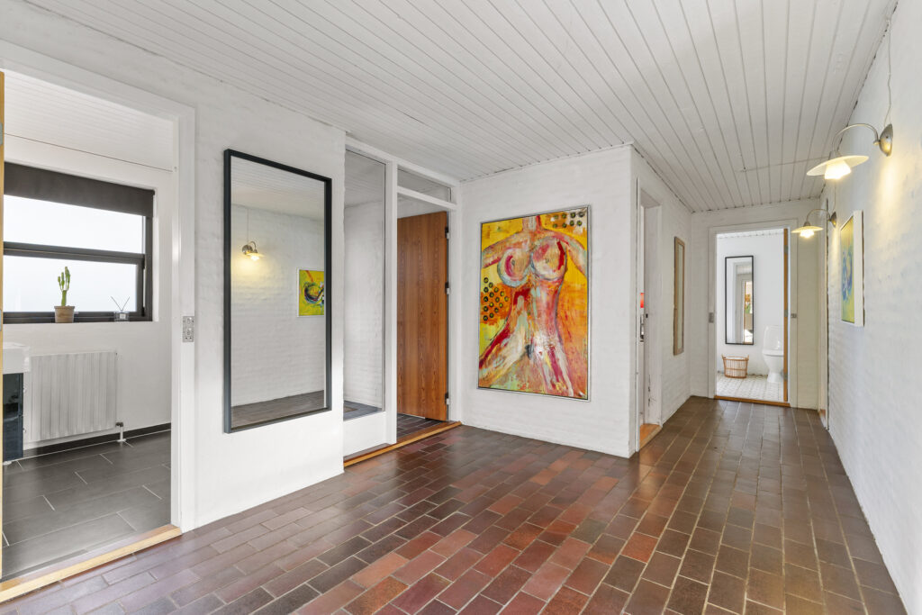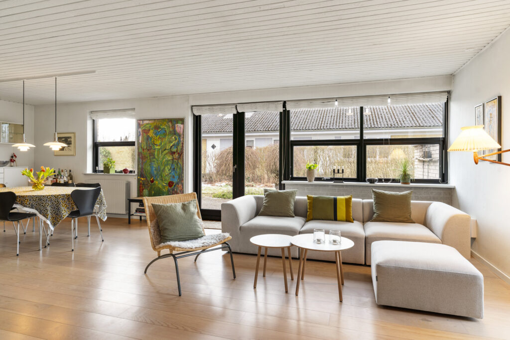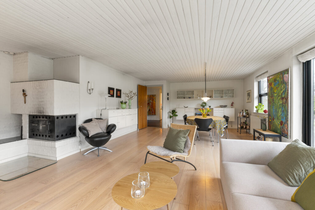 Indenfor mødes du af rummelige opholdsarealer, der indbyder både til fællesstunder og tiltrængt privatliv. Køkkenet med spiseplads er hjemmets samlingspunkt, hvor lange måltider let flyder over i samtaler. Fra den store stue er der direkte udgang til den sydvendte terrasse med ideelle solforhold og en gnidningsfriovergang til udelivet – perfekt til afslapning og gæster under åben himmel.