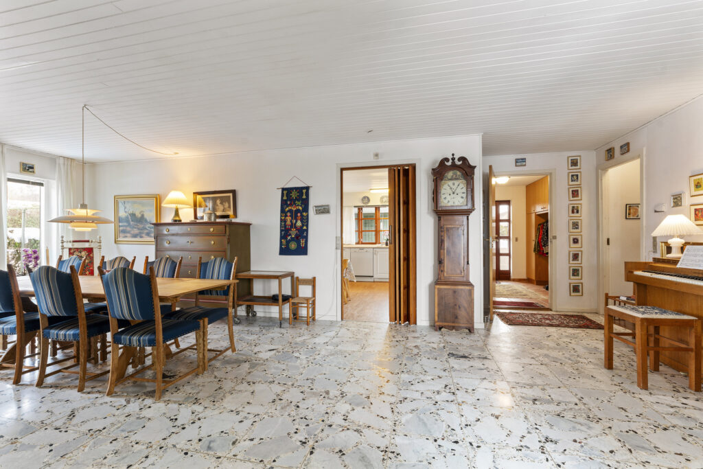 Udestuen kan bruges året rundt og danner et smukt bindeled mellem det indre og det ydre. Fra opholdszonen træder du ud på terrassen, der byder på sol det meste af dagen og udsigt over en skøn have. Her er rammerne perfekte til både børns leg og afslappende aftener under åben himmel, og flere hyggelige kroge i haven gør det let at følge årstidernes gang. Planløsningen omfatter fire værelser, der er samlet omkring husets private afdeling, hvilket giver bådeplads til familieliv og mulighed for hjemmearbejde eller hobby.