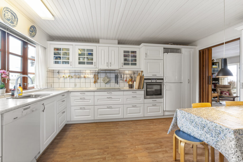 Området forener fordelene ved byliv og natur på fornem vis – med skoven som nærmeste nabo og let adgang til skolen, indkøb og et levende idrætsliv, alt sammen via trygge stisystemer. Boligen udfolder sig på ét plan og rummer 190 velindrettede kvadratmeter, hvor familien samles i et spisekøkken, der glider naturligt over i stue og udestue. Her strømmer dagslyset ind gennem store vinduespartier, hvilket skaber en behagelig og sammenhængende atmosfære, hvor hverdagslivet let finder sin rytme.