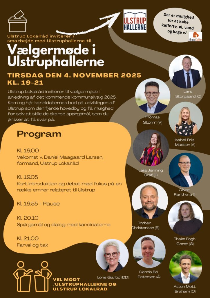 Den 4. november arrangerer Ulstrup Lokalråd et stort anlagt vælgermøde, hvor de har inviteret politikere fra samtlige partier til debat i Ulstrup Hallen. Det starter klokken 19, og forventes afsluttet klokken 21.